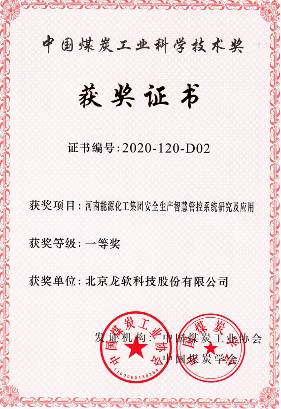 龍軟科技參與完成的科研成果“河南能源化工集團安全生產(chǎn)智慧管控系統(tǒng)研究及應(yīng)用”榮獲中國煤炭工業(yè)協(xié)會2020年度科學(xué)技術(shù)獎一等獎