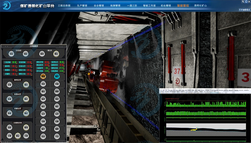 (3)支持?jǐn)?shù)字孿生礦山管控應(yīng)用。基于GIS+BIM+VR技術(shù)和統(tǒng)一的大地坐標(biāo)系,實現(xiàn)了地質(zhì)模型、設(shè)備模型、開采環(huán)境與機電設(shè)備控制之間的拓?fù)浜瓦壿嬯P(guān)系的一體化集成,為智能化控制提供可視化地理環(huán)境。