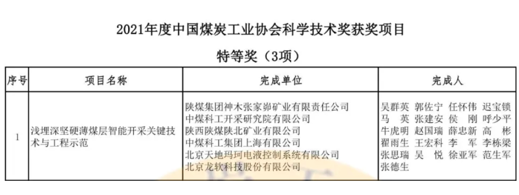 2021年12月10日,中國煤炭工業(yè)協(xié)會2021年度科學(xué)技術(shù)獎獲獎名單頒布,北京龍軟科技股份有限公司喜獲特等獎一項(xiàng)、一等獎一項(xiàng)、三等獎一項(xiàng)。