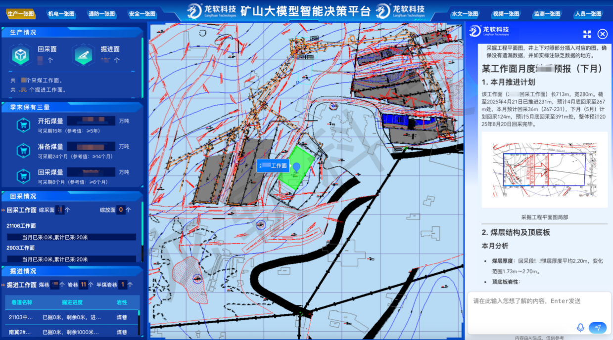 龍軟時空大模型是公司依托多年的AI技術研發(fā)和礦山行業(yè)應用經驗積累,基于已授權的數(shù)項發(fā)明專利,融合包括DeepSeek在內的先進通用大語言模型和自主研發(fā)的時空智能技術,研發(fā)推出的跨越感知、認知、執(zhí)行等多維度、多模態(tài)等人工智能技術體系。該技術解決了大模型在礦山行業(yè)知識嵌入不足、無法處理矢量時空數(shù)據等短板,支持接入礦井內部各類安全、生產、運輸、經營等動態(tài)數(shù)據以及礦井自有技術資料、專家經驗等知識,實現(xiàn)基于時空大模型的智能決策分析系統(tǒng),提供面向礦山各類應用場景的視覺智能識別、專業(yè)知識問答、圖形智能處理、業(yè)務綜合決策等能力,其中視頻AI分析已覆蓋9大類、86小類場景模型,并結合多智能體封裝管控業(yè)務流程,實現(xiàn)礦山生產調度、安全評價、輔助決策相關的“智能看圖、智能問數(shù)、智能監(jiān)控、智能分析決策”等應用。