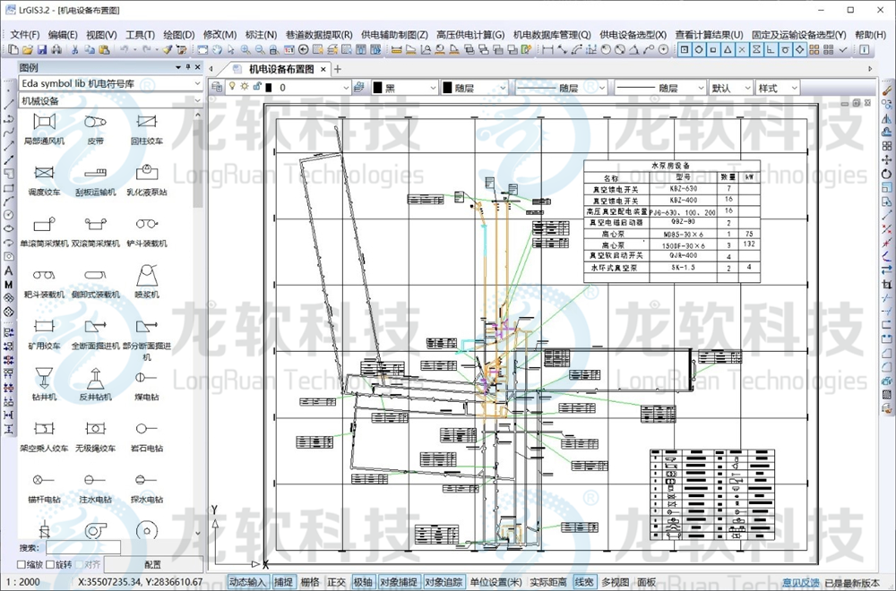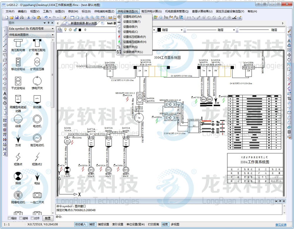 供電設(shè)計圖形協(xié)同管理系統(tǒng)包括機電圖形協(xié)同管理、供電設(shè)備選型計算和固定設(shè)備選型計算等模塊。機電圖形協(xié)同管理是基于一張圖管理模式,以在線協(xié)同的方式設(shè)計運輸系統(tǒng)圖、設(shè)備布置圖、供排水系統(tǒng)圖、通訊聯(lián)絡(luò)系統(tǒng)圖、人員定位系統(tǒng)圖、供電系統(tǒng)圖等機電圖形。供電設(shè)備選型計算是基于標(biāo)準(zhǔn)的供電設(shè)備圖例庫繪制供電系統(tǒng)圖,對電動機、變壓器、電纜、各類開關(guān)進(jìn)行相應(yīng)的供電計算與校驗,從設(shè)備參數(shù)數(shù)據(jù)庫選出合適的供電設(shè)備,并自動生成供電設(shè)計報告。固定設(shè)備選型計算是對輔助運輸巷絞車、運輸機、排水等設(shè)備進(jìn)行選型計算,選出合適的設(shè)備,生成相應(yīng)的設(shè)備選型設(shè)計報告。