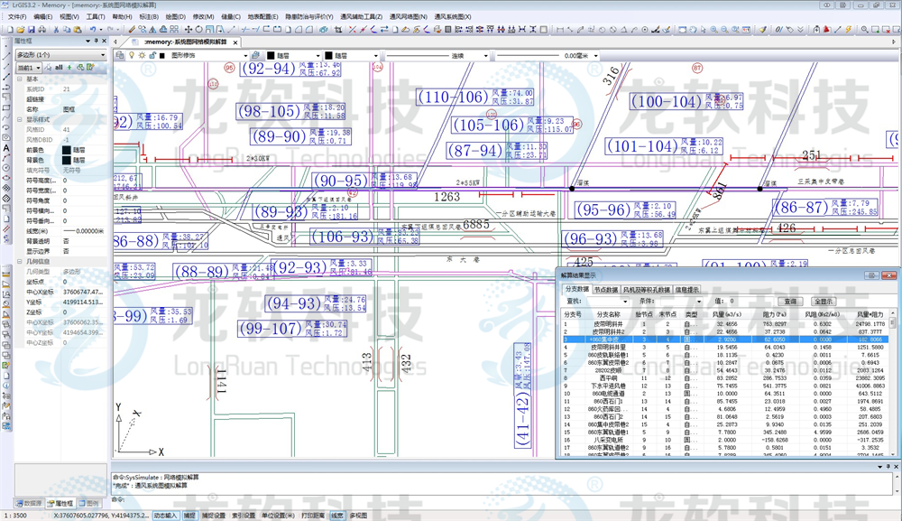 通防圖形協(xié)同管理系統(tǒng)主要包括通風(fēng)制圖和通風(fēng)系統(tǒng)仿真等模塊。通風(fēng)制圖包括繪制通風(fēng)系統(tǒng)圖、避災(zāi)路線圖、注漿系統(tǒng)圖、瓦斯抽放系統(tǒng)圖、瓦斯抽放曲線圖、防塵系統(tǒng)圖、防火系統(tǒng)圖、監(jiān)測監(jiān)控系統(tǒng)圖,自動生成通風(fēng)系統(tǒng)立體圖、通風(fēng)網(wǎng)絡(luò)圖、通風(fēng)系統(tǒng)壓能圖;通風(fēng)系統(tǒng)仿真主要包括通風(fēng)阻力測定數(shù)據(jù)的錄入和處理,通風(fēng)網(wǎng)絡(luò)模擬解算,通風(fēng)系統(tǒng)風(fēng)量調(diào)節(jié),風(fēng)機優(yōu)化選型等功能。